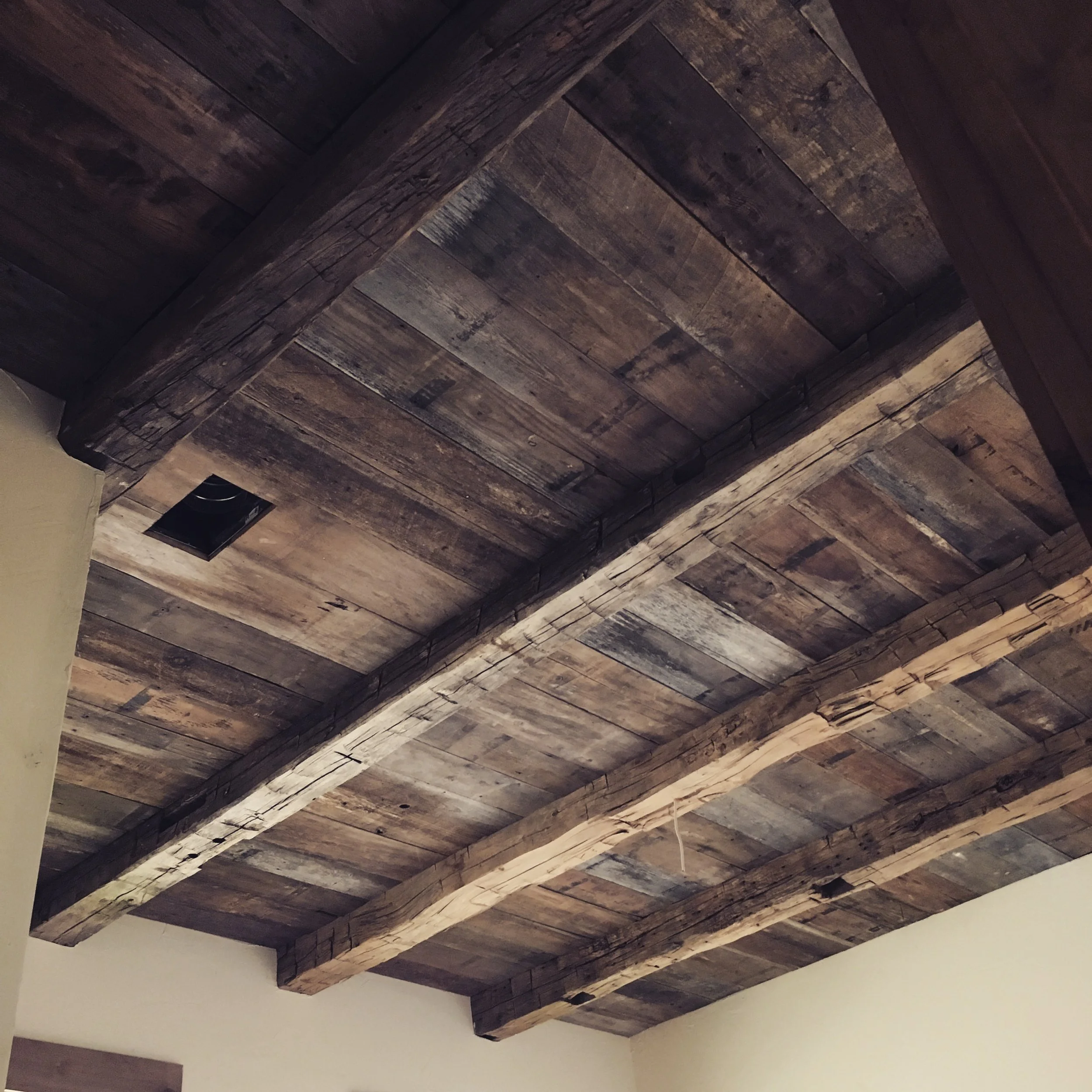 All made with reclaimed pine from old factories. Almost every aspect of the home was custom. We came into this home and installed all the reclaimed wood on the walls of the master bedrooms and four seperate rooms with different looks.
